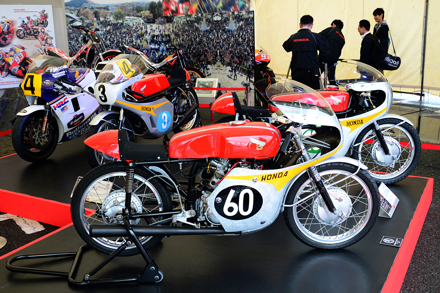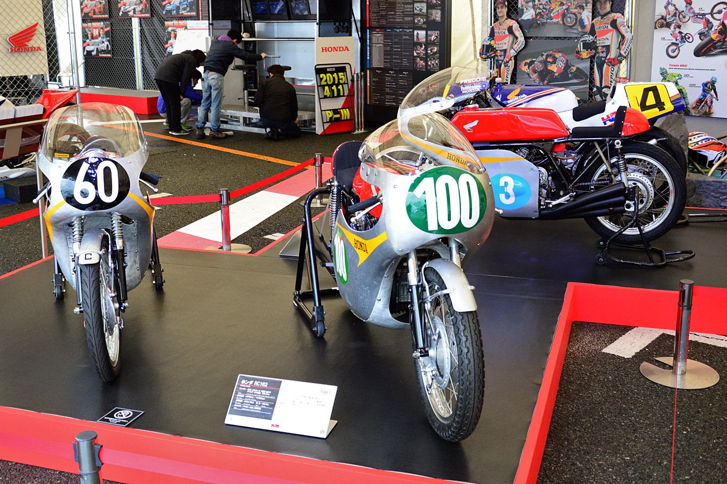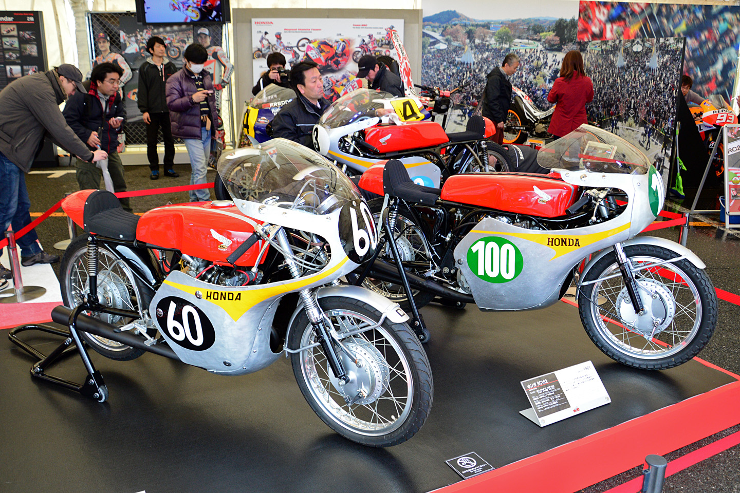 ホンダは往年の2輪レーシングマシンを多数展示。ゼッケン60は125ccエンジンを搭載したワークスレーサー「RC143」。’60年の世界グランプリでホンダ初の優勝を飾った記念すべき1台。ゼッケン100は250ccクラスのワークスマシン「RC162」。’61年、高橋国光氏が日本人初のグランプリ優勝を飾ったほか、出場した10戦すべてで優勝した初めての世界制覇マシン。