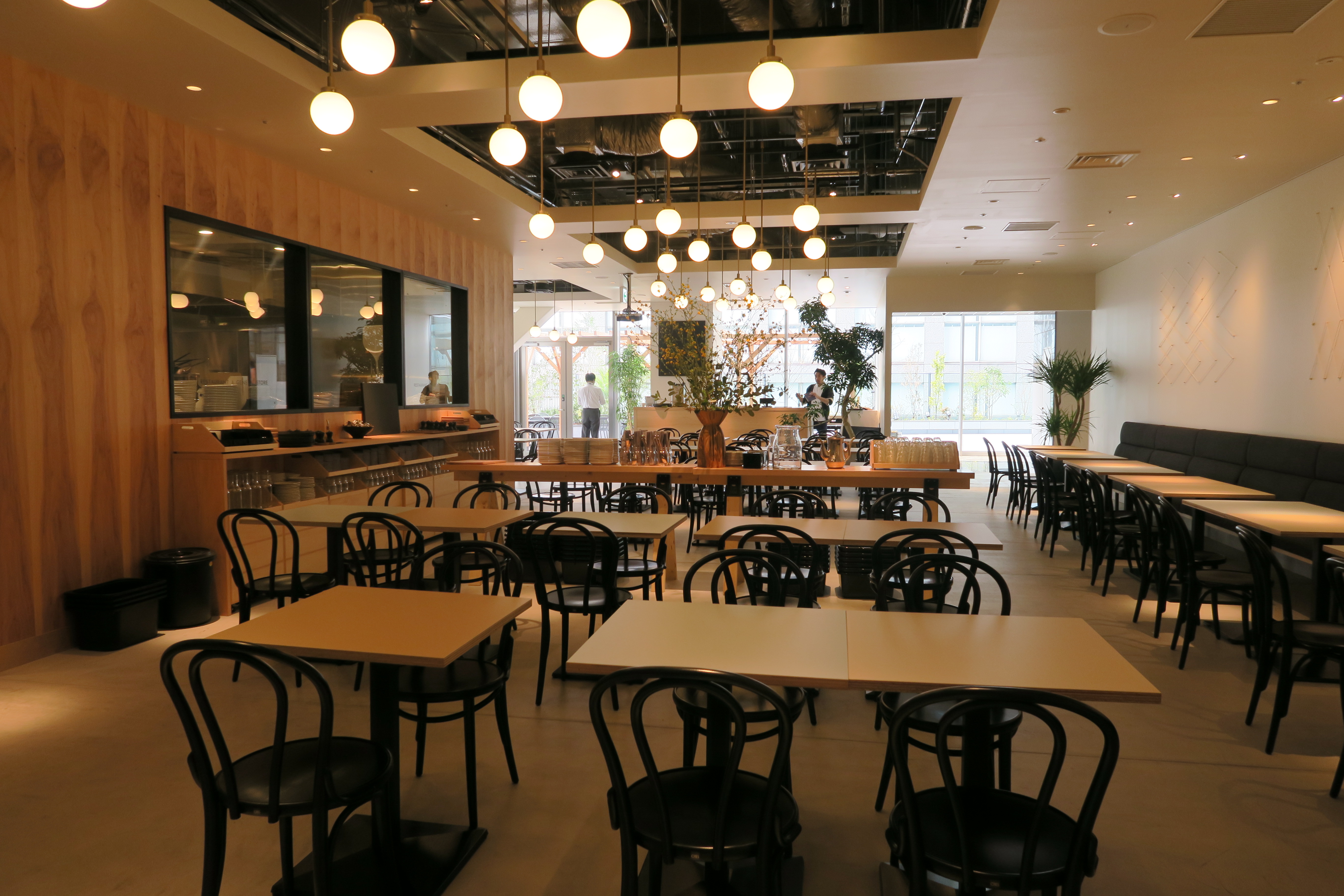 そこから先は全120席におよぶ、開放感に満ちたメインダイニング空間。鎌倉店の約1.5倍の広さとなる空間は、奥のテラス席に向かって思い切りよく“抜け”ている。テラスや窓からの採光をふんだんに取り込んでいることから、日中はとにかくのびのびと心地よい感覚、リラックスした雰囲気が印象的だ(もちろん、テラスへとつづくこの“抜け感”は、夜は夜でまた異なる魅力を帯びるのだと想像する)。