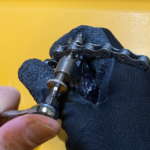 この時はディレイラー(外装変速機)が取り付けボルトの部分からもげ、チェーンが切れてしまいました。このようなトラブルを解決するには、チェーンラインが出る最適なギアにチェーンを掛け直して再接続する必要があります。ディレイラーを通していたチェーンを切り、新しいアンプルピンを挿してチェーンを接続します。