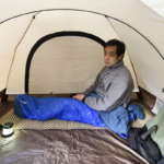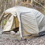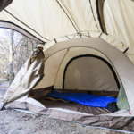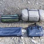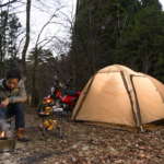 居住空間は幅150cm、奥行き220cmあり、大人2人と子ども1人が寝られる広さ。ソロキャンプではちょっと贅沢に感じるくらいのサイズでした。重量はポールまで含めて約3.9kg。メチャメチャ軽いというわけではありませんが、バイクに積んで行くには十分な軽さでしょう。