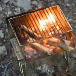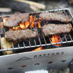 大きめの薪を入れても安定しているので、クッカーなどをのせても不安はありません。網も付属しているので、焼き肉だって楽しめます。ただ塩コショウを振っただけの肉なのに、ツーリング先で食べるとなんでこんなに美味しいんでしょう? キャンプツーリングに行くなら、絶対楽しみたいメニューの1つですね。