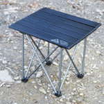 「コンパクトアルミテーブル」(3850円)は、展開時の天板サイズが400×340mm、高さ340mmとコンパクトながら耐荷重は40kgとダッチオーブンものせられるほど。ブラックアルマイトにヘアライン加工を施した天板は仕上がりもキレイで、キャンプはもちろんガレージなどでも使いたくなる雰囲気。このあたりは、さすがバイクパーツメーカーが手掛けただけのことはあります。