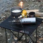 脚がしっかりしているので、耐荷重だけでなくアウトドアでの安定感もかなり高い。バーナーをのせて調理もしましたが、不安なく鍋を置けました。チェアとの高さのバランスも良く、これはぜひペアで持って行きたいところですね。収納時のサイズは120×430×100mmとコンパクトで収納袋も付属するのもありがたいところです。