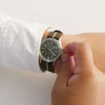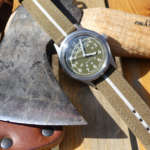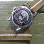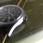 購入後、さっそく装着するとまず軽さに驚き。いつも自動巻きの機械式ダイバーズを着けてるので重さは雲泥の差。またオリジナルを意識したオリーブカラーが美しく、ケース径36mmということで女性でも使えるユニセックス仕様なのもポイント。小ぶりかつケースが薄いためジャケットの下でも全く悪目立ちしません。
