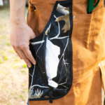 胸元にペンホルダー、そしてふたつに分かれる裾はハンドル付きで薪運びにも重宝します。