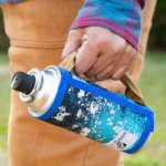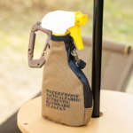 キャンプの必需品であるアルコールスプレーですが、ボトルの生活感が残念。でも、こんなジャケットを被せればテンションがあがります。しかもカラビナ付きで持ち運びも整理も簡単。