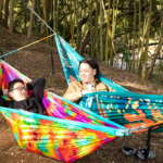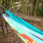ふたつのハンモックを同じ木に取り付けただけだと、このようにピタッとくっつきます。これはしょうがない現象です。