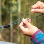 あとはハンモックのウーピースリング(特殊な編み方をしていて、引っ張るだけで無段階に長さを調節できるロープ)やデイジーチェーンのループを調整して木と木の中間になるよう調節します。
