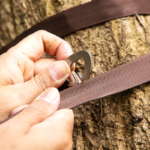 「チタニウム・ダッチ・クリップ」は文字通りクリップで、幅が狭い方に木を保護するための幅広テープ(ツリーハガーなどと呼ばれています。幅2cm以上のテープで、短期間のハンモック泊であれば木への負担が少ないとされています)の端を通しておき、幅が広い穴に引っ掛けます。