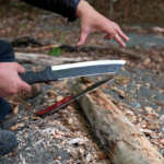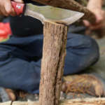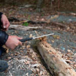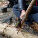 薪を作る際に刃物を使用するのは、枝を払う、使いやすい大きさに薪を切る、割る、火が付きやすいように削る、などでしょうか。通常、斧やノコギリを使うことが多いのですが、大型ナイフであれば、まかなえる部分は多いのです。
