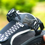 最大のポイントは、アッパーとバックル。アッパーはネオプレン(ウェットスーツに使われる素材)に近い質感で伸縮性があり、メッシュなので通気性はバッチリ。足にピタッとフィットして、しかも足へのあたりがやさしい。