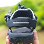 甲側のストラップでも調整できるのですが、フィット感の主な調整はカカト側のストラップで行います。ここにはシンプルにWHITE MOUNTAINEERINGの文字が。ちなみにストラップの模様も、WMをあしらったものなんだとか。