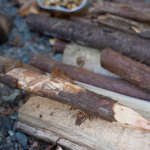 フライパンスタンドの作り方は、とっても簡単。適当な長さに切った枝にフライパンの柄が挟めるように切り込みを入れ、地面に刺せば完成です。
