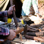 先端を尖らせるのは、斧やナイフでチョッピングし、ナイフで削って、鉛筆みたいに尖らせればOKです。尖らせるのは、完成した後、地面に差し込むためです。