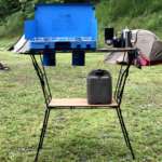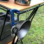 で、よく考えられているのが、天板とフレームの隙間。うま~くアウトドアギアが引っ掛けられるように作られています。そりゃクッキングテーブルだからね、オタマにシェラカップ、ランタンとか、まあ実用的なものから見栄えがよさそうなものを好きに引っ掛けられるのがお気に入りポイント。