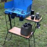 さてメインの天板は取り外し可能になっていて、中段に付け替えられます。じゃあ空いた上の部分はどうするのって? そう、「クランク クッキングテーブル」はその名の通り調理台なので、市販のガスバーナー(ツイン)をはめ込める仕様になっているのです。