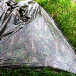 この張り方の一番良いところは、シートもタープが担ってくれるので、荷物が減ります。