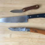 上からFEDECA「ヤマ飯ナイフ」、家庭用の包丁、そしてキャンプで包丁がわりによく使われているフォールディングナイフで、なるべく刃先が平行になるよう並べてみました。