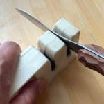 その点、包丁用の簡易研ぎ器はバランスよく両刃を研げます。砥石のほうが鋭角に刃をつけられると言われていますが、研ぎ慣れていない人にとって簡易研ぎ器が使えるのは心強い。