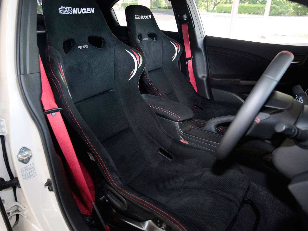 内装では、フルカーボン製のシェルを持つアルカンタラ仕様のフルバケットシート「MS-R」(25万7040円+シートレールセット:29万5920円)、もしくは、バックレストのリクライング調整が可能なセミバケットシート「MS-Z」(17万0640円+シートレールセット:19万9800円)がカタログに載ります。いずれもブラックのアルカンターラが表皮に用いられ、ヘッドレスト部分に、白く「無限 MUGEN」の文字が入った精悍なシートです。