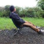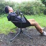 ちなみに「スターゲイズ キャンプチェア」のオートリクライニング機構だとこんな感じ。ももと背中がほぼ90度の角度から、115度まで開きます。ハンモックのように両側2点で支えているので、ベンチなどに足をのせれば名前の通り、無理なく星を見上げられます。