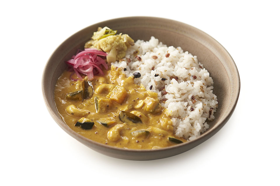 「カシューナッツのホッダ(スリランカ風ココナッツカレー)」*7/4~販売 生のカシューナッツをたっぷりのココナッツミルクで煮込んだ、鰹だし香るスリランカ風カレー。ココナッツミルクのコク、かぼちゃの甘み、カシューナッツの旨み、と風味を丁寧に重ね合わせたカレーはクセになる味わい