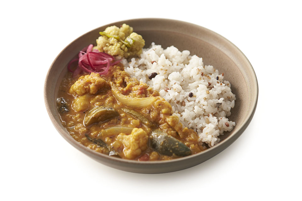 「サンバール(豆と野菜のスパイスカレー)」*7/11~販売 南インドで定番の酸味とスパイスが香る豆と野菜のカレー“サンバール”。さわやかな酸味の正体は、なんと梅干しなのだとか。茄子、玉ねぎ、カリフラワーなどの野菜をたっぷり加えた具沢山カレー