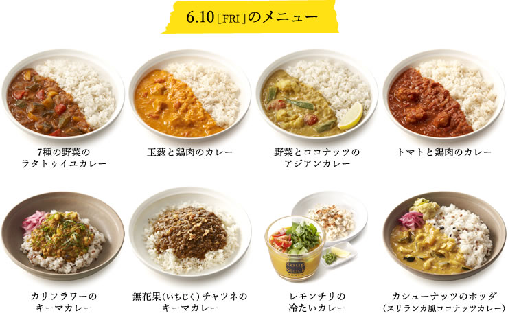 日程は今週金曜日(6月10日)1日限り。この日は、全国のSoup Stock TokyoがCurry Stock Tokyoと化し、店頭ではカレー(8~10種類)とカレーにまつわるサイドメニューのみがラインナップされる。