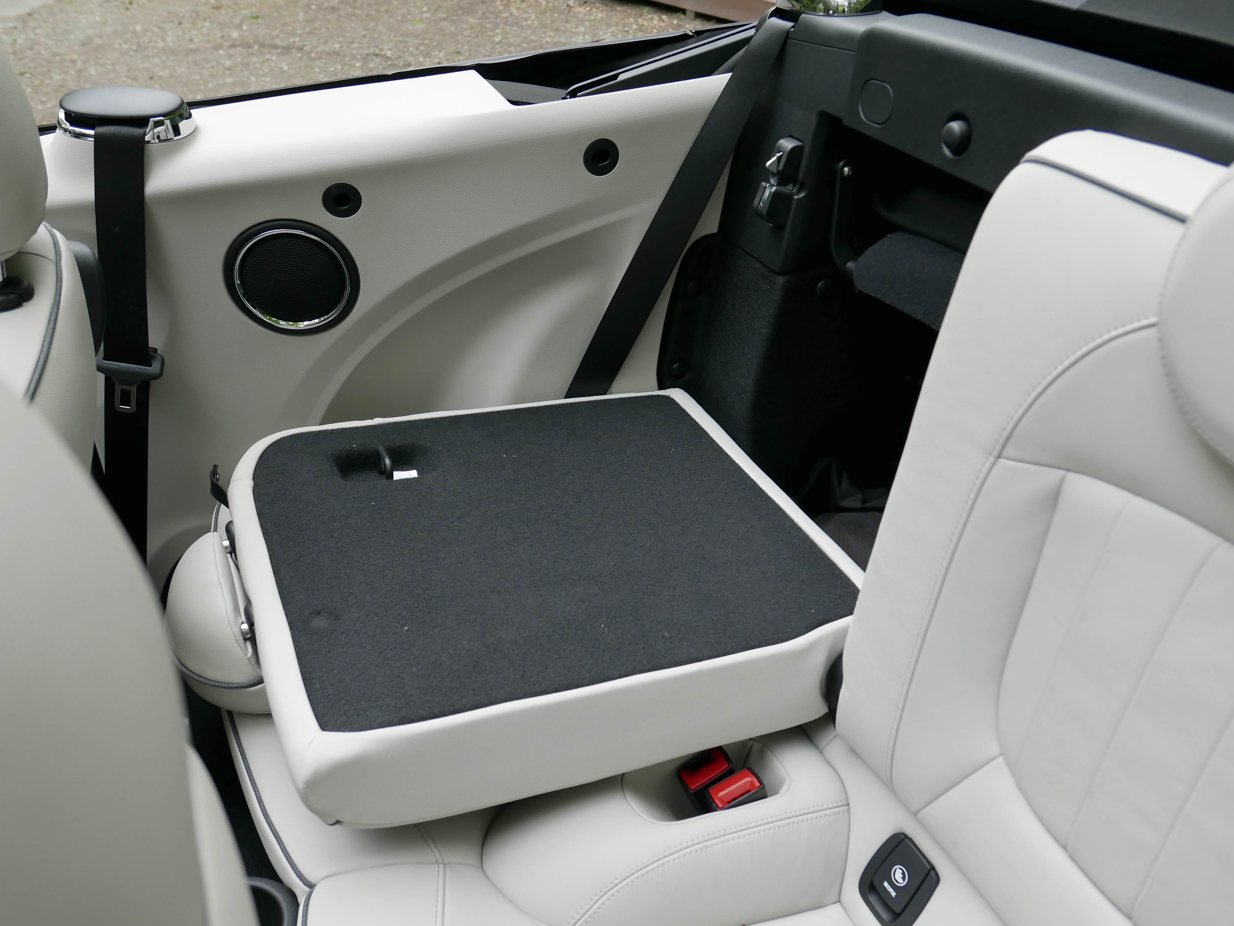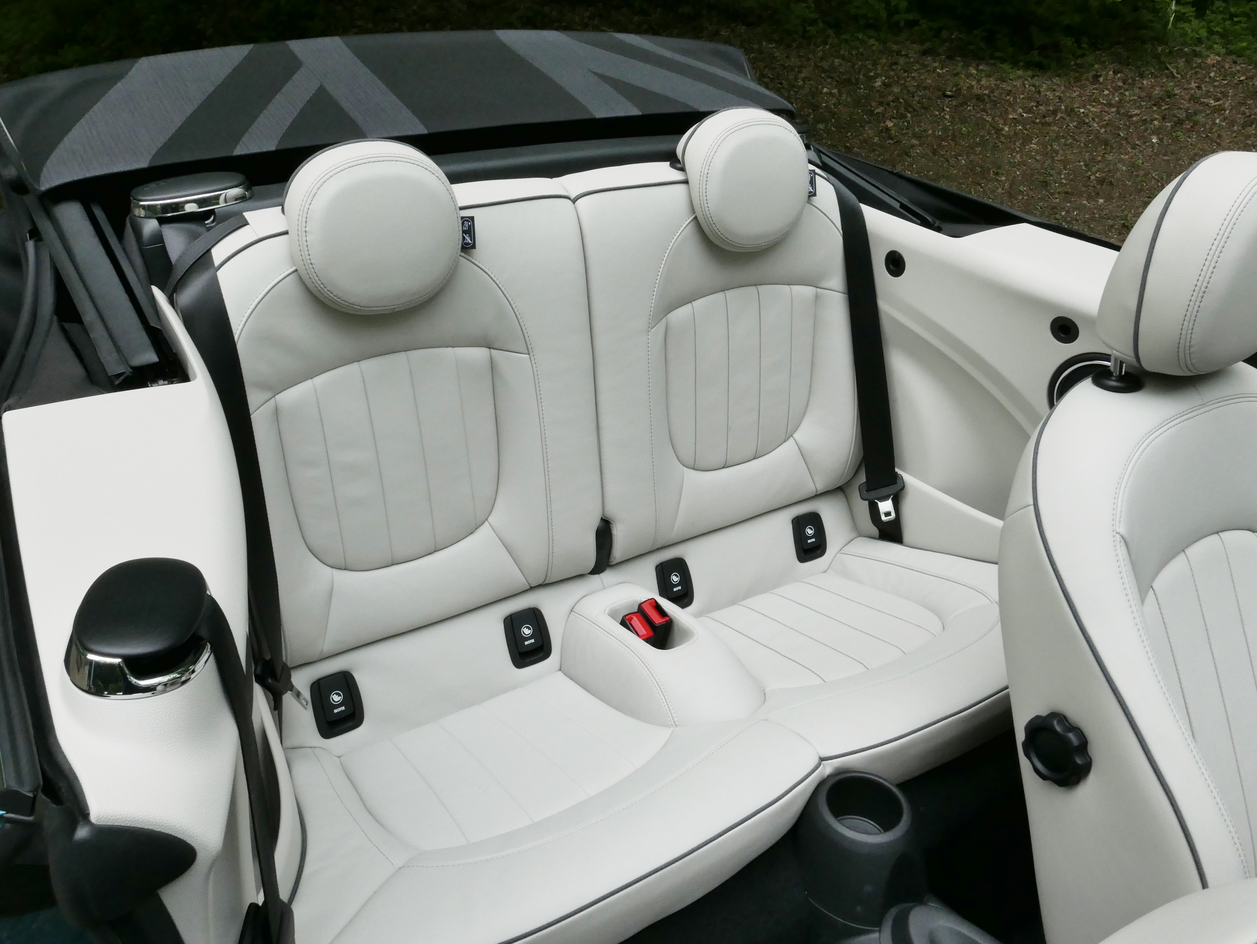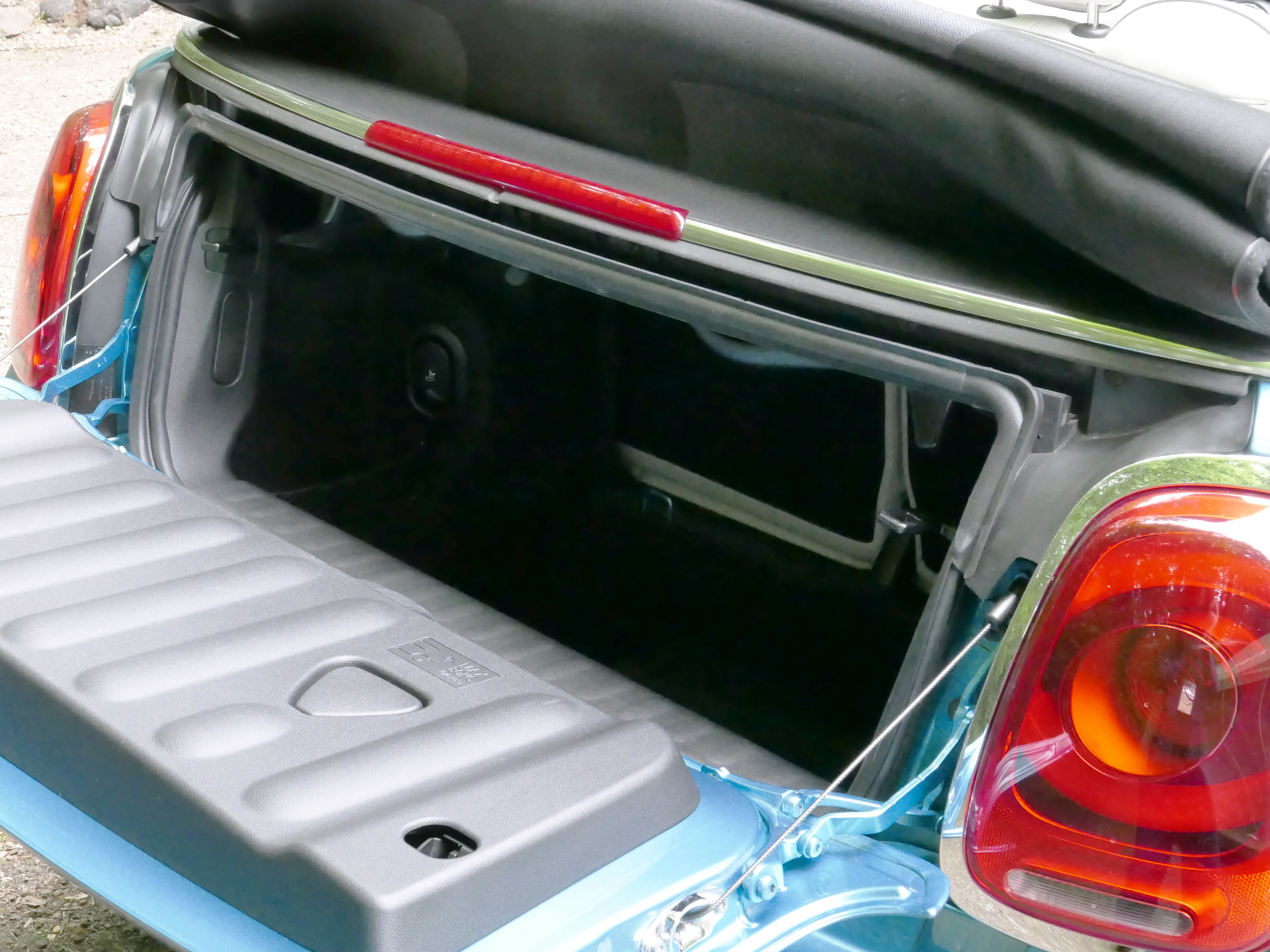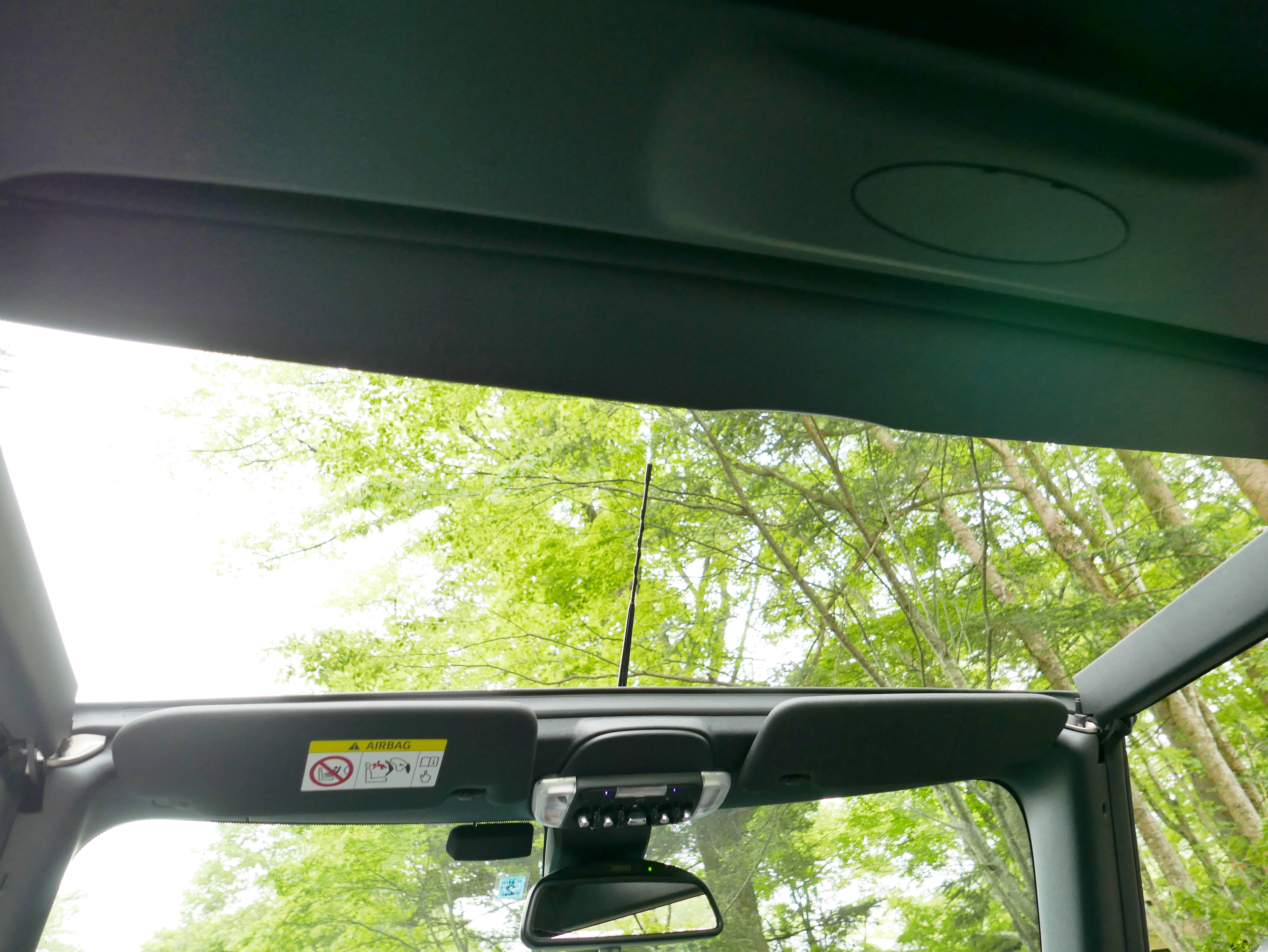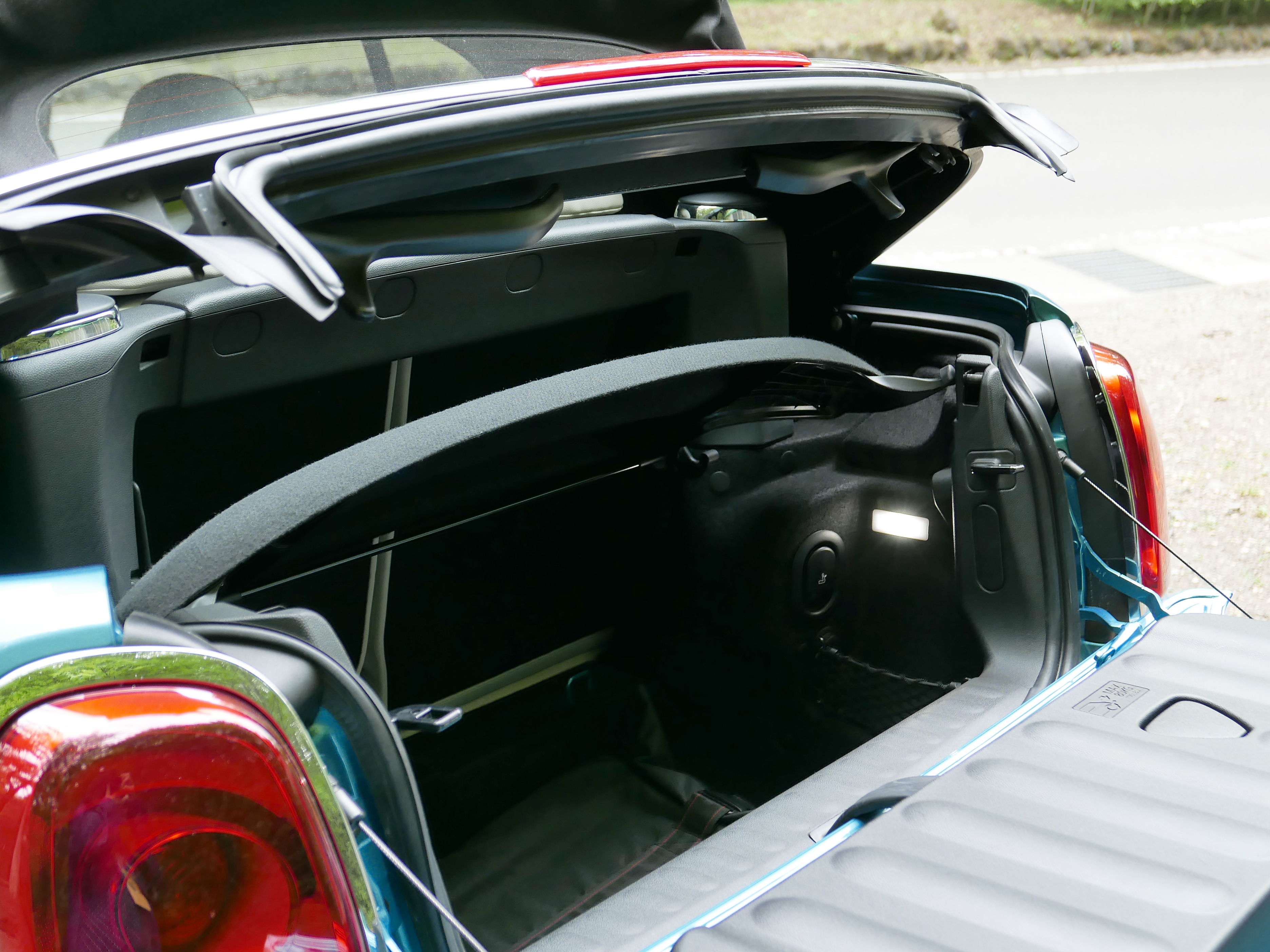電動で開閉するソフトトップは、30km/h以下ならスイッチを長押しすればガバッと開いて、コンパクトにリアトランクの上に折り畳まれます。収納時は少しだけ盛り上がってしまうので、ルームミラーの後方視界が少しだけ遮られます。なのでオープン走行時は、ドアミラーの角度を調整し、後方視界を得るよう心掛けました。