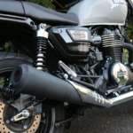 スタンダードはシルバーのメッキ仕上げになっているマフラーは、「S」だとつや消しのブラック。バンク角を確保するために、ややカチ上げられたデザインとなっています。