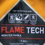 そして最大のポイントが、“フレイムテック”という耐熱性のある樹脂の被膜を作る特殊加工が施されていること。焚き火などで火の粉がついても生地の溶解を遅らせて穴があきづらくなっています。