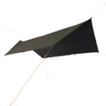 タープにすると、いわゆる六角形のヘキサタープになります。2箇所にポールを通す穴が設置されているため、ビギナーキャンパーでも設営しやすい仕様です。270×160cmと小型なので、ソロキャンプ時のシェルターにしたり、ハンモックの下に張ってアンダーキルトにしたりといった使い方がいいかも。もちろん生地は防水仕様です。