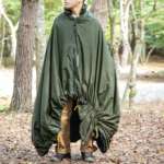まずはポンチョとして着用。実際に羽織ってみるとその暖かさに驚かされました。一見、レインコートのようなペラペラな感じかと思いきや、生地の間にヒートシートが入っているため体感的にすごく暖かい。また、冷たい風が吹く秋冬の山でも体温を奪われにくいように防風性も高く設計されています。