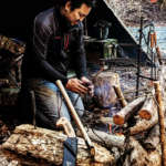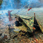 軍幕ではなくタープでもいいのですが、化繊のタープの場合は、焚き火から180cm以上は離して張らないと、火の粉が飛んで穴が開きます。上部にタープを張る場合は焚き火の真上に張るのではなく、焚き火の煙の逃げ道を作る意味で、真上は空間を作るような配置がベター。