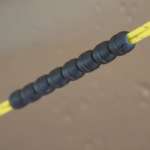 この張ったロープにいろいろと吊り下げていくわけですが、普通のロープに吊り下げる場合、カラビナやS字フックなどを利用しますよね。でもこの「ハンギングライン」は、余計なモノは必要ありません。そこで活躍するのが黒い玉です。