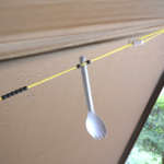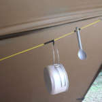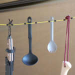 ここに吊り下げたいものを差し込んで玉を寄せれば、2本のロープが挟んだモノをギュッと保持し、ぶら下がってくれます。なんてラク! どれもロープにがっちり挟まれていて、落ちそうな気配は微塵もありません。