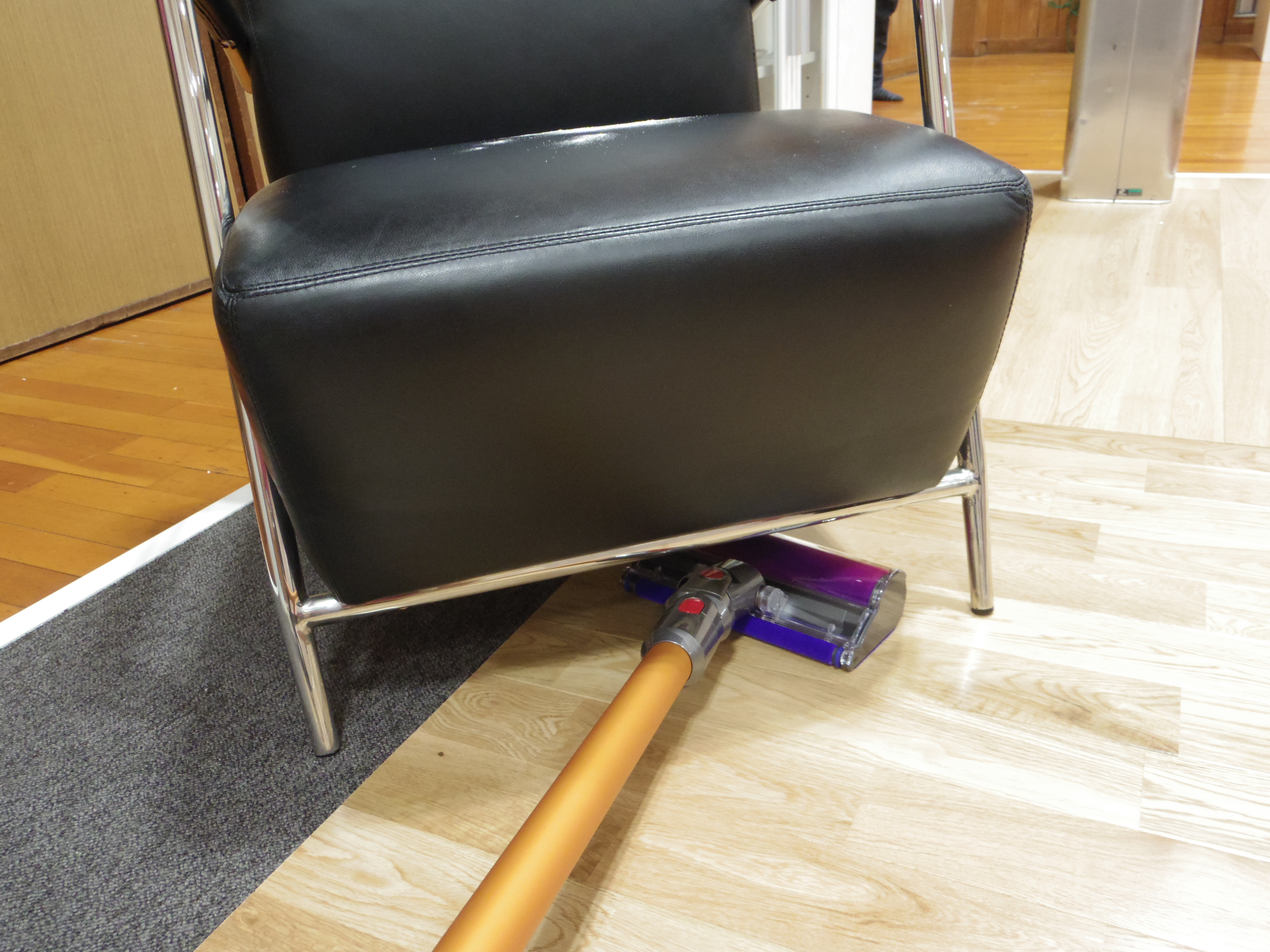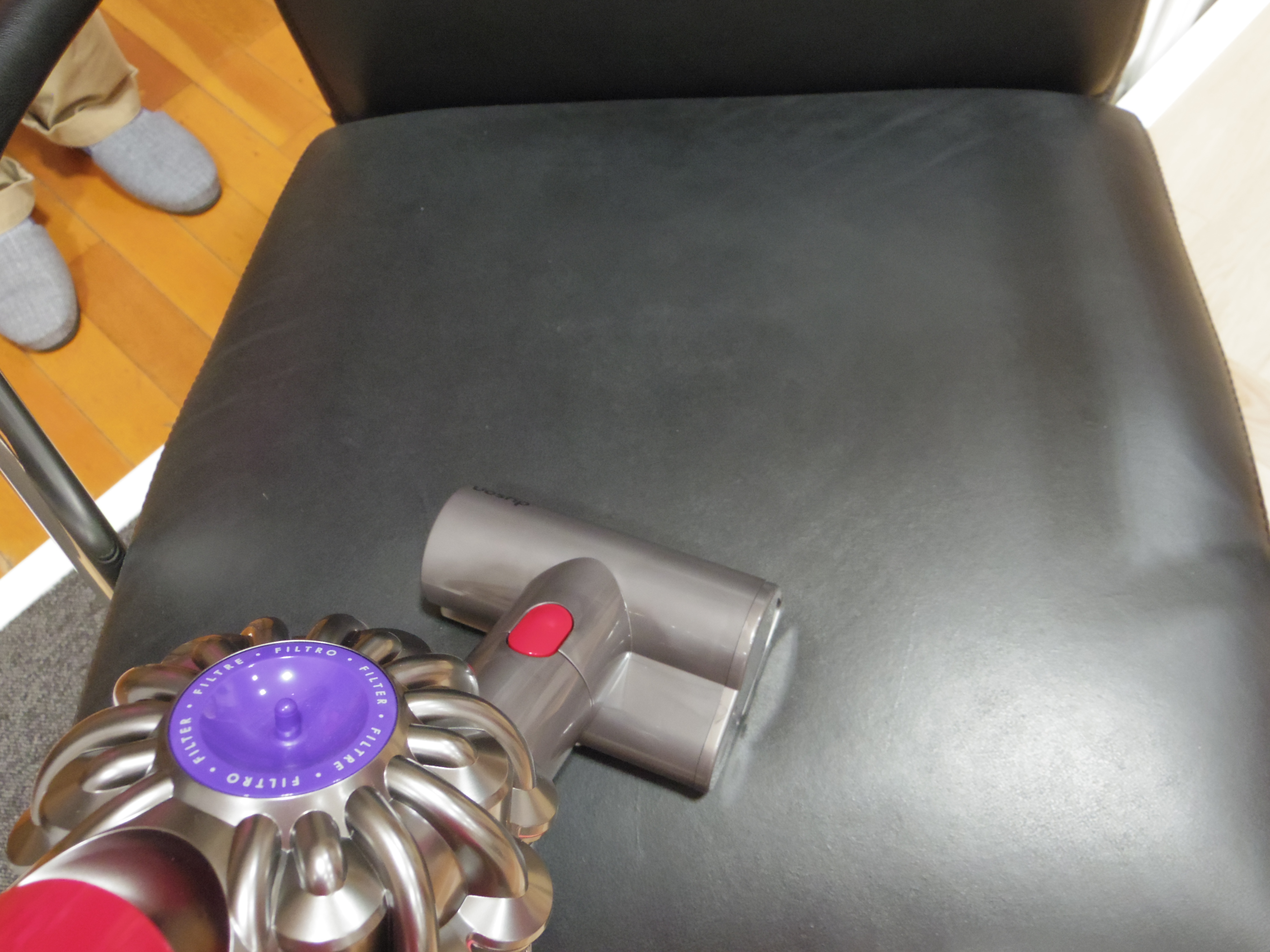 スイッチを入れて最初に感じたのは、運転音が静かになったということ! 説明会では、内部の風路設計を改良することで、前モデルのV6より約50%も低減したと説明していました。実際に聴き比べてみるとダイソン独特の“キーーーン”とした高音があまり感じられなくなり、本当に静かになっています。日常のシーンに例えると、掃除機をかけていても会話ができるレベル。これなら、朝や夜でも短時間なら使えそうです。