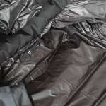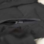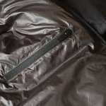 フロントのメインファスナーは、エレメント(務歯)の大きな普通のプラスチックファスナーなのですが、フラップ付きなので風をしっかりと遮ります。しかも、ペラペラの布だけでなくしっかりと中わたも封入。