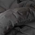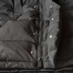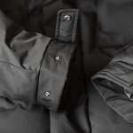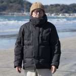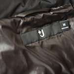 表地は、ポリエステル60%、複合繊維40%で、アウトドアブランドのダウンのように柔らかなナイロンではなく、マットで生地感のあるしっかりした素材。中わたは、ダウン90%、フェザー10%で、フードを前部分の立ち上がりが高く実用的です。
