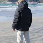 そんな+Jで購入したのは、「ダウンオーバーサイズパーカ」のブラック、Mサイズ(着丈73.5、肩幅53.5、身幅62cm、裄丈<ゆきたけ>87.5cm)。身長164cmで、普段はSサイズを着るのですが、インナーにフリースを着る想定でゆとりあるサイズを選びました。