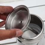 ほかのマキネッタ同様、粉を平らに整えたらゴムパッキン、メッシュのコーヒーフィルターを載せてフタをねじ入れます。ゴムパッキンとフィルターがズレたり裏表が間違っているときっちり閉まらないので、閉じた後、水漏れすることがないか確認しましょう。