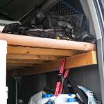 カーゴスペースを上下に二分するしっかりとした棚板は、ホームセンターで入手した建築資材を駆使して固定。大量のタックルを乗せてもびくともしない頑丈さでした。