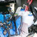 タックルの用意をリアハッチの下でするため、薄暗い時間帯でもよく見えるLEDのモールライトを取り付けています。こちらももちろんDIYで設置したのだそうです。ちなみに車内には100vのインバーターを積載し、沸かしたお湯でカップ麺やコーヒーを楽しんでいるそうです。