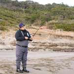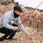 渡邉さんにマンツーでキャスティングを教わるという幸せ者の編集E。すぐにナイスなキャスティングフォームを身に着け、「シュパッ」っと小気味のいいサウンドを響かせながらブレイクラインや離岸流にミノーを投げ入れます。
