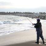 しかしながら、ルアーは狙うべき離岸流には遠く及ばず、浜辺は不安感に包まれます。その中で口数少なに小首をかしげているのが、言い出しっぺの編集E。ルアー釣り初体験ということで、今ひとつ伸び悩んでいるご様子。