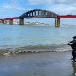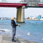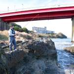 釣り場の河口には大きな橋がかかり、向こう岸の魚市場などの様子が見渡せるのどかな雰囲気。水平線から荒波が打ち寄せるマッチョなサーフとはまた違った趣があります。前回のサーフでのフルキャストに慣れたのか、みんな割とすいすいキャストしてルアーを操ります。うまいじゃない。