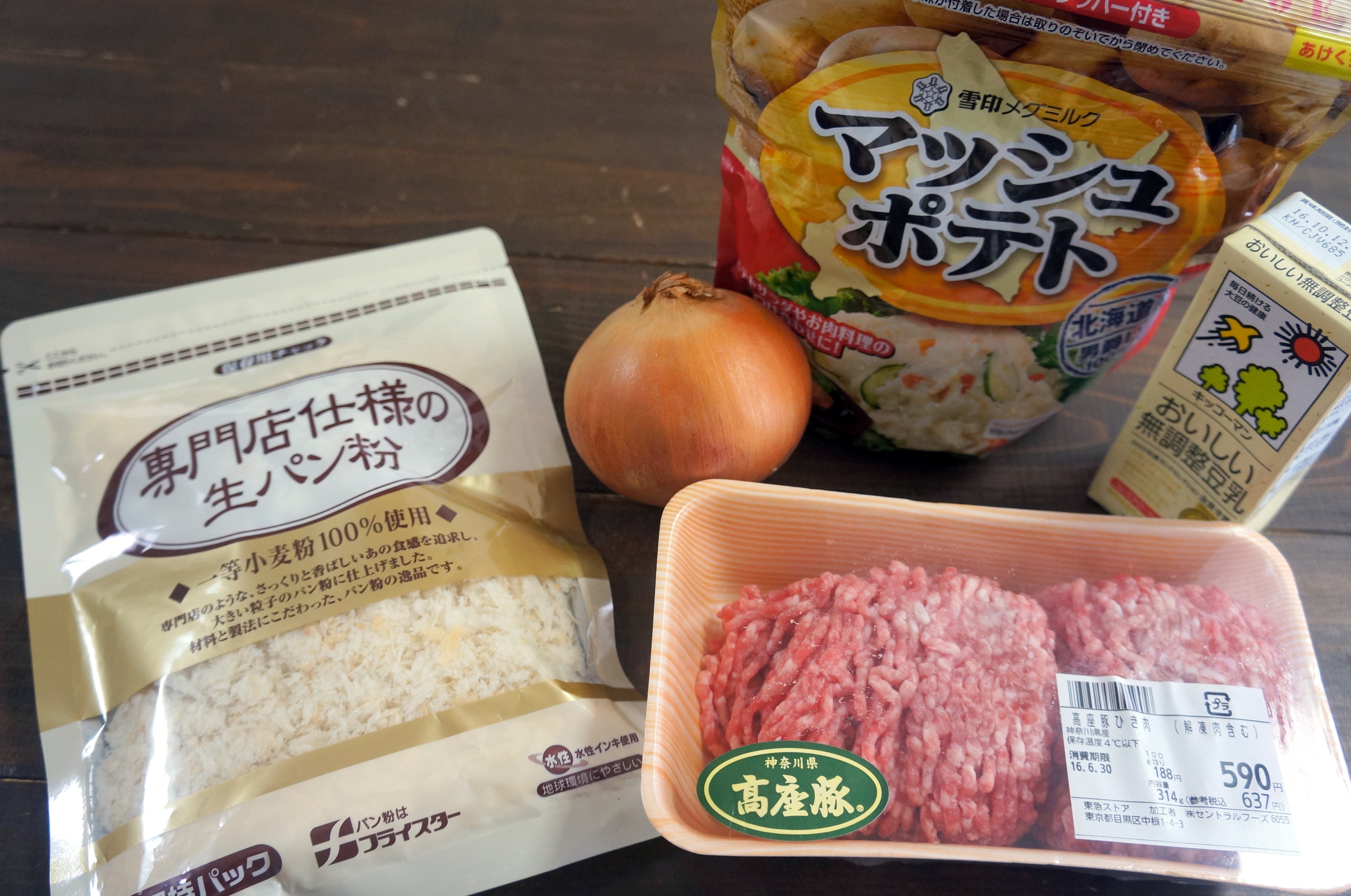 スコップコロッケに使う基本の材料は、じゃがいも、玉ねぎ、挽き肉(今回は合い挽き肉を使用)、パン粉、牛乳のみ。