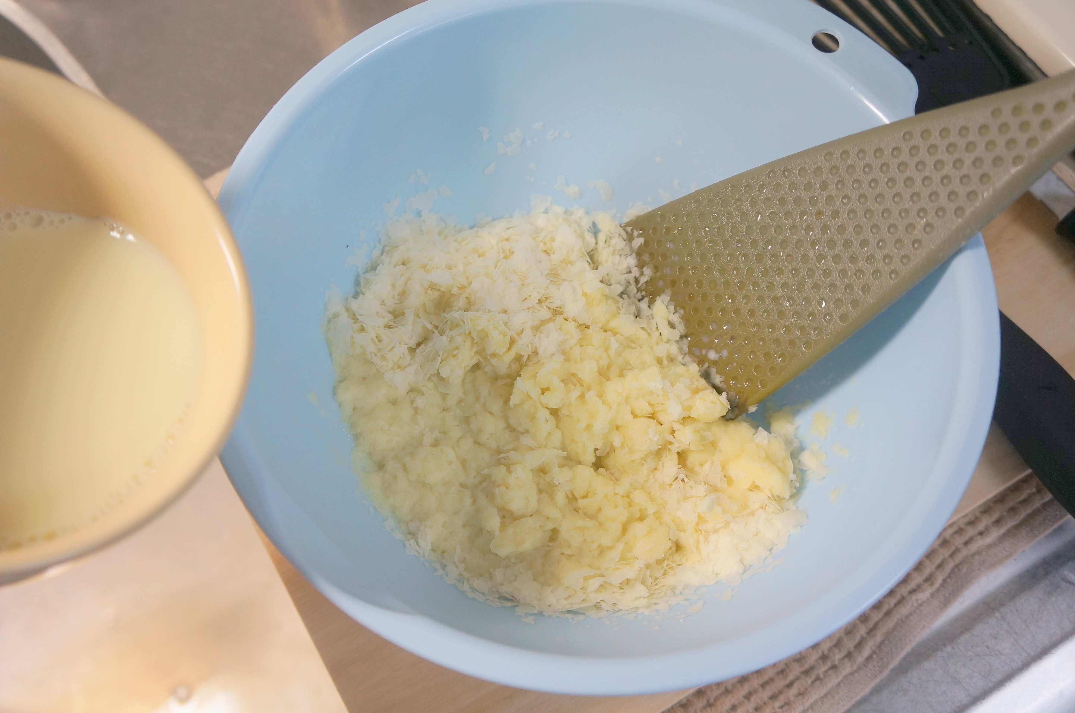 フレーク状になったじゃがいもにお湯を加えるだけでマッシュポテトが完成するので、とにかくラクチン! 通常はお湯を加えるのですが、今回は温めた豆乳を使ってみました。豆乳を少し加えては混ぜる、という動作を繰り返しましょう。