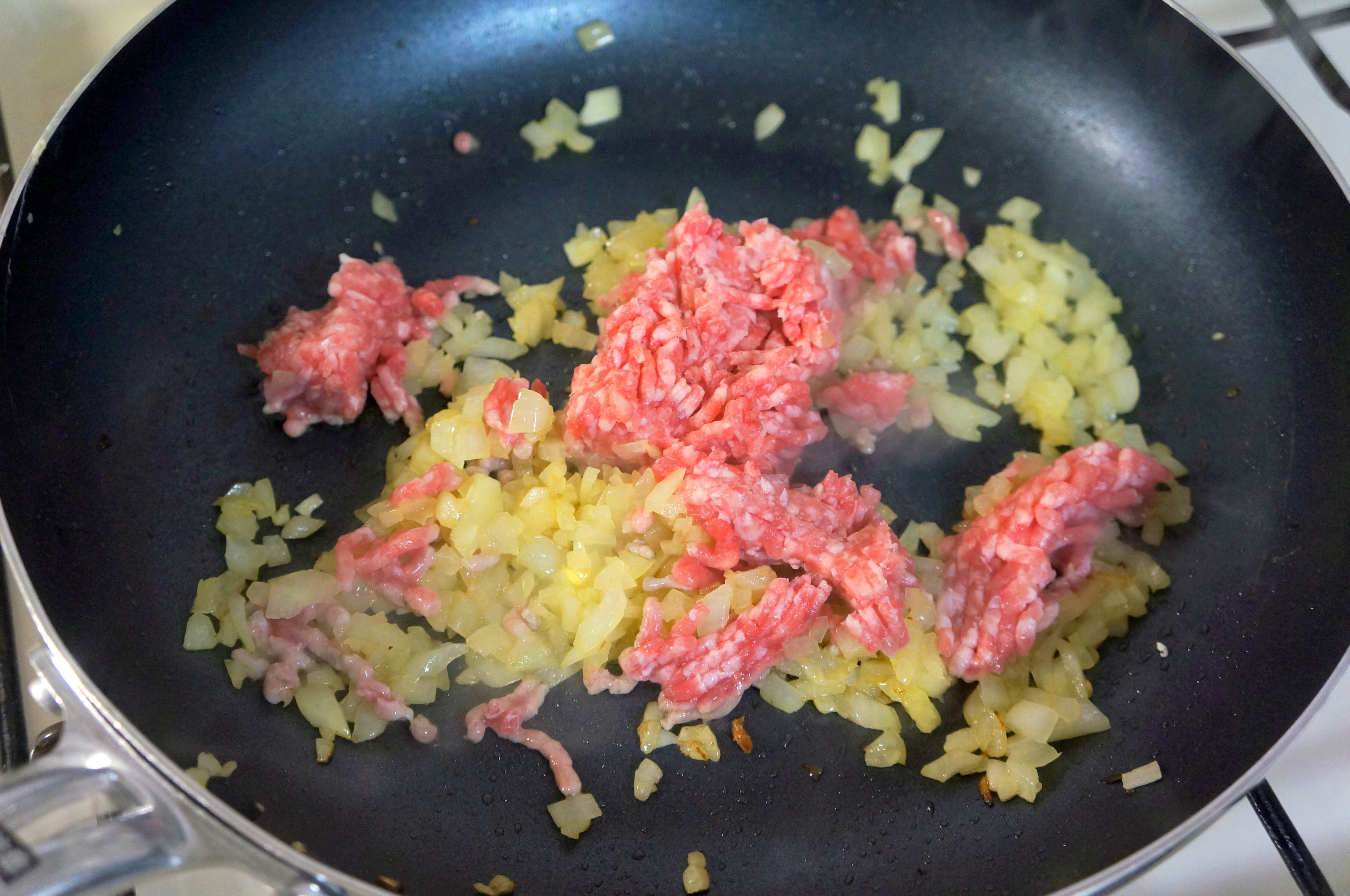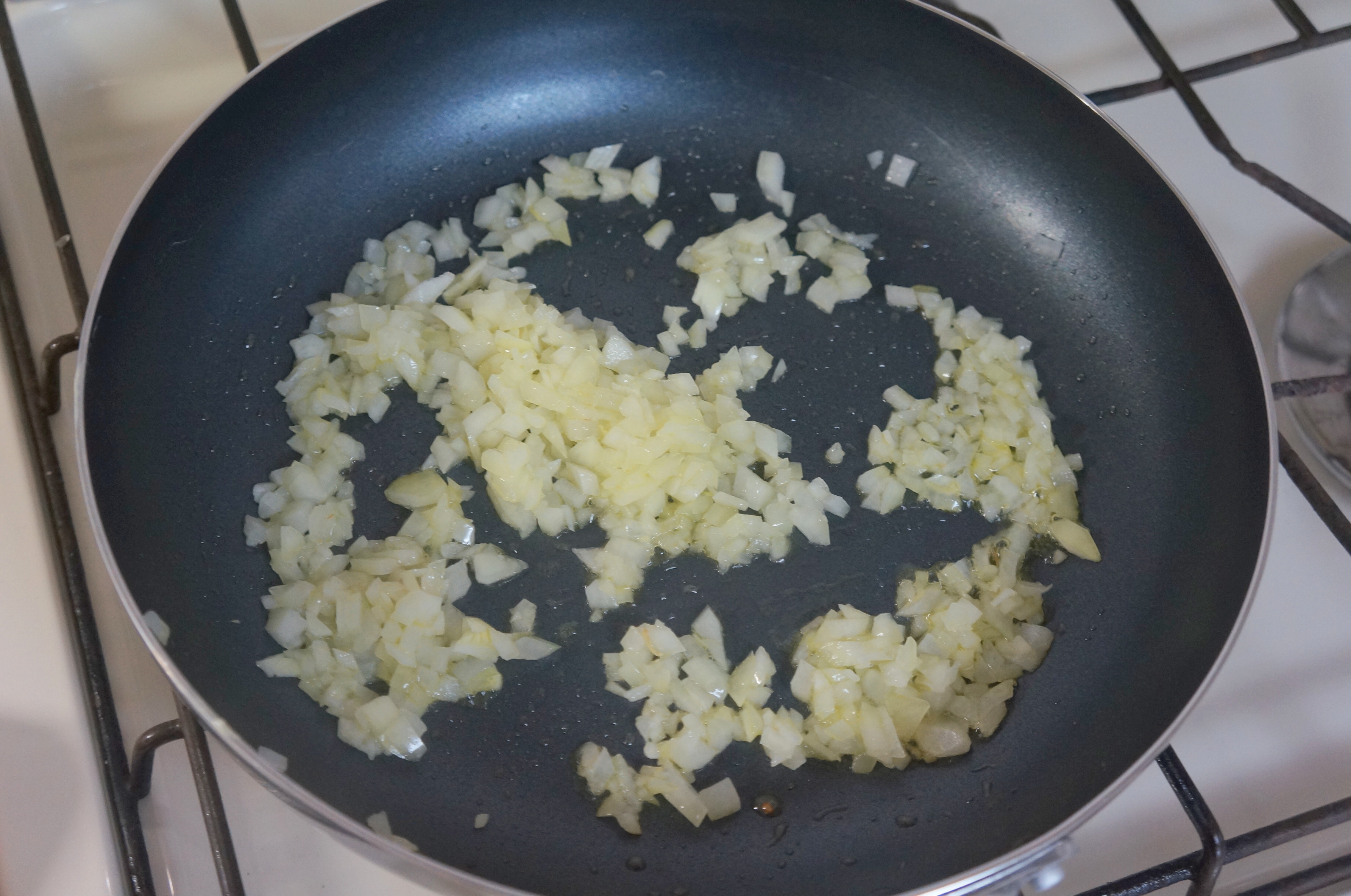 それが済んだら、フライパンに分量外の油を引き、みじん切りにした玉ねぎを入れて炒めましょう。
