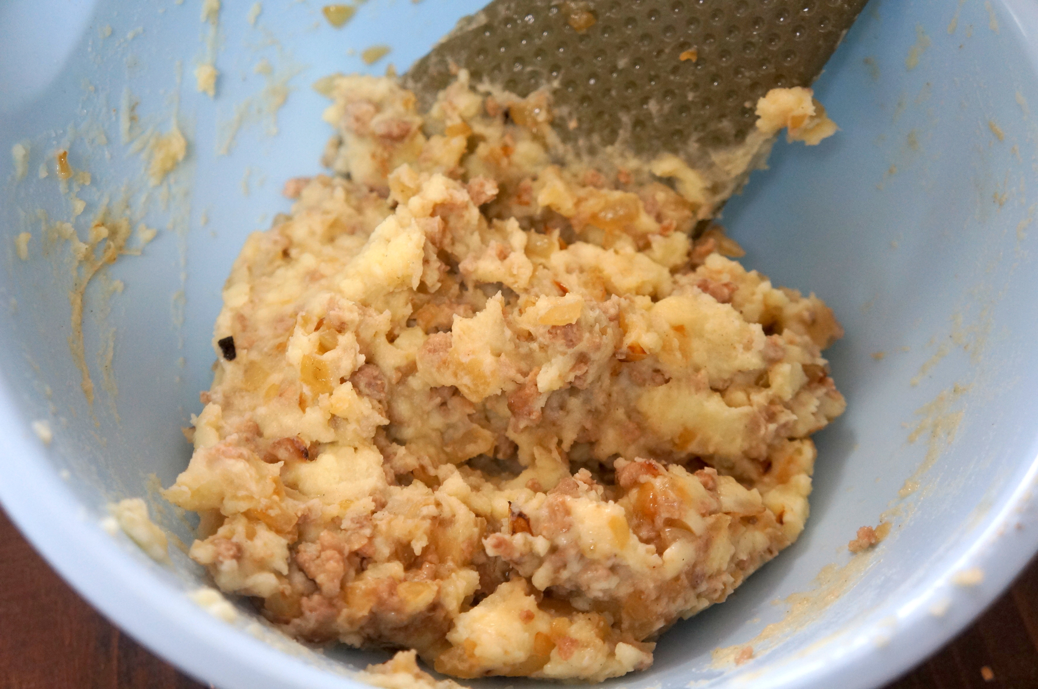 火が通ったら、先に作ったマッシュポテトに炒めた玉ねぎと挽き肉を肉汁ごと加えます。